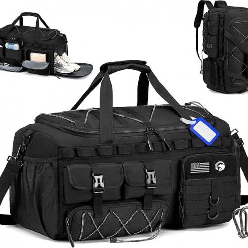 Gym Bags for Men with Shoe Compartment 60L Tactical Duffle Bag 3 in 1 Carry on Duffel Bag Travel Backpack Weekender Overnight Range Bag for Workout Football, Black