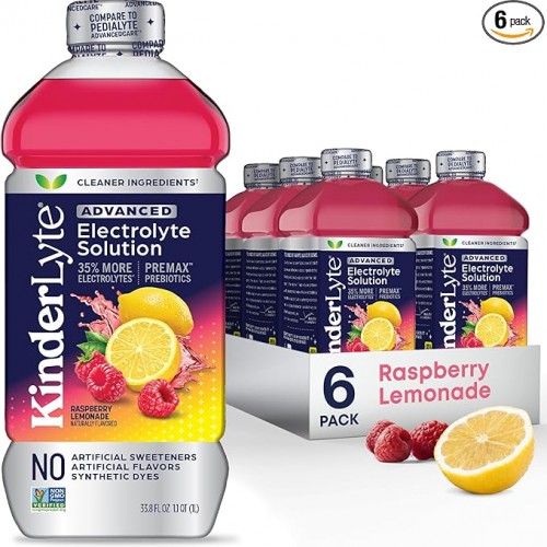 Kinderlyte Advanced Electrolyte Solution, 2X Faster Hydration vs. Water Alone, No Artificial Sweeteners or Flavors, No Synthetic Dyes, Raspberry Lemonade, for Kids and Adults, 33.8 fl oz (Pack of 6)