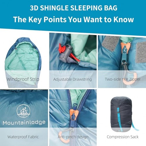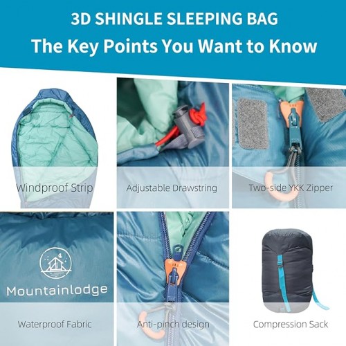 Mountainlodge 3-4 Seasons Cyan Two-Layer Shingle Sleeping Bag with Inner Pocket for Adult,Perfect for Backpacking,Traveling and Hiking,Including Free Compression Stuff Sack