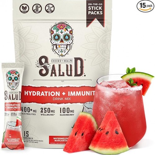 Salud 2-in-1 Hydration Packets + Immunity Electrolytes Powder, Watermelon Margarita – Agua Fresca Drink Mix, Elderberry, Dairy & Soy Free, Non-GMO, Gluten Free, Vegan, 1g Sugar (15 Servings)