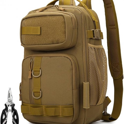 Fishing Backpack – Tackle Sling Bag- Fishing Gear Bags with Rod Holder and Fish Plier (Tan)