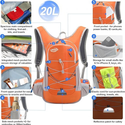 - 【20L Capacity & Multiple Compartment】This hydrate package provides a 20L storage space size of 18in x 11in x 3.9in. Multi-compartment zipper pocket provides you with plenty of space to store your clothes, iPad, wallet, snacks and more. 2 mesh pockets on the sides are perfect for umbrellas and water bottles. And 2 waist pouches on the belt can hold your valuables such as credit cards, phones, keys, etc.