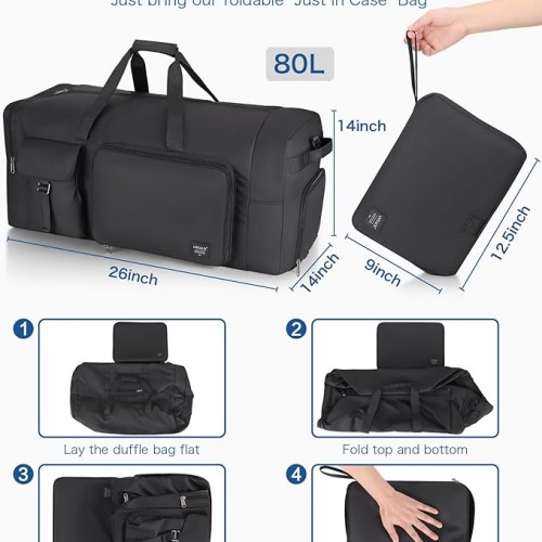 - [ Foldable 80L Extra Large Duffle Bag ] : It expands to 26 x 14 x 14 inches, has a capacity of 80 liters, weighs 1.7 pounds and can be fast folded into itself with a compact size of 12.5″ x 9″, only 1/18 of a regular size luggage. Always take this folding duffel with you on any trip, open up when you need to carry gifts for your friends or transfer stuffs from your damaged luggage.