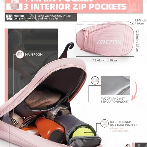 - 【Multi-functional Pockets】The Arcfox tennis backpack has multiple compartments and mesh pockets so you can neatly organize your tennis balls and essentials. There is also an additional wet/dry pocket for storing sweaty clothes and towels after your matches.