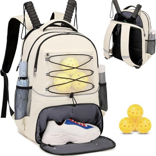 - 【Large Pickleball Backpack】Main compartment has a padded pocket for a pickleball paddle or 15.6″ laptop. The front features mesh pocket and a towel strap, holding 3-4 balls and a towel. The bottom has a separate shoe compartment. There’s also a front wet/dry separation pocket. Inside, small pockets and a key hook help organize gear. The back has a zippered pocket, and side mesh pockets hold water bottles or umbrellas. A padded back zippered pocket fits 2 more paddles. Size: 12.6”×8.6”×18.9”.