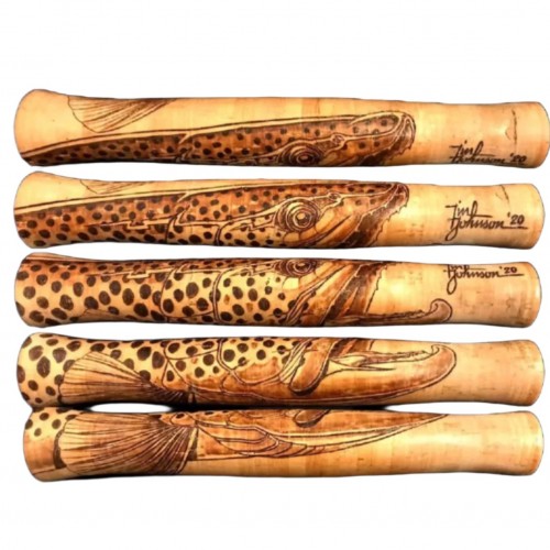 Hours of work go into painstakingly hand burning original artwork of your choice into the cork grip of your flyrod, turning the whole rod into a unique work of art. After a brush application of cork sealer, it’s ready to fish. It won’t just set it apart from your buddies’ rods or other rods of the same model; it will be different from any rod in the world.