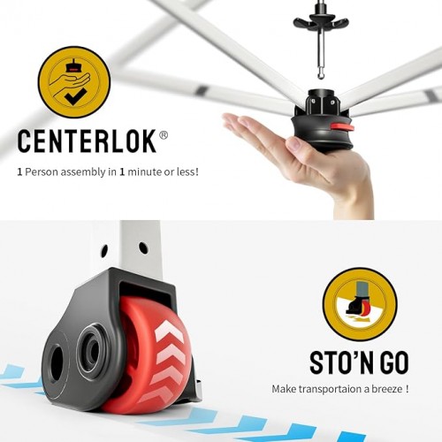 - STO’ N GO SYSTEM – Our lift-free system makes collapsing, storing, and transporting the 8×8 tent a breeze. The 8×8 tents can be stored with the fabric attached, with a specialized pocket for 4 sandbags, 8 stakes, and 4 guy ropes. Integrated wheels in the feet allow easy movement even when the instant shelter tent is set up, by simply lifting the side without wheels. This feature is especially useful for quick setup and takedown at locations like the patio or sports events