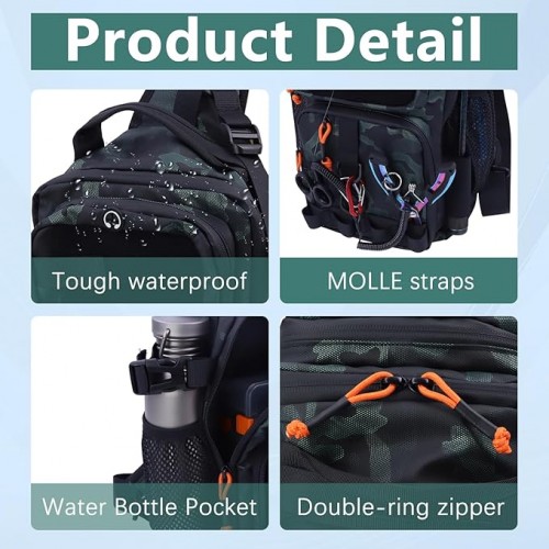 - This fishing backpack is made of tough 420D tear-resistant nylon material, which can keep your equipment dry when fishing, camping or hiking. The hydrophobic coating can resist external moisture, and the inner PVC layer can provide additional protection to ensure that your equipment is protected from bad weather.