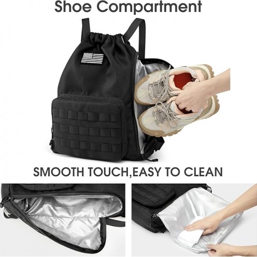 - 【Separate Water-resistant Shoe Compartment】Our drawstring backpack has a shoe compartment to store your shoes or wet clothes to separate from the rest of your belongings, which material is water-resistant and easily wipes clean. It also can be a normal pocket for your daily use.