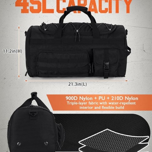 - 5-Zip Compartment Design – Smarter Organization:Features 5 external zip compartments: a spacious main compartment (with 2 open sleeves + 1 internal zip pocket), a tactical-style front pocket with gear loops, an extra zip pocket with flap cover, a ventilated shoe pocket, and a rear zip pocket built into the luggage strap. Everything stays organized and easy to reach