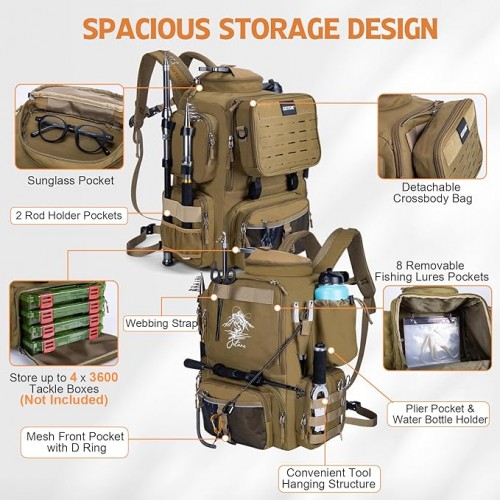 Goture Fishing Backpack, 900D Water-Resistant Tackle Backpack with Rod Holders, 58L Large Storage Gear Fishing Tackle Bag with Detachable Crossbody Bag,8 Lure Pockets,Bottle Holder for Camping Hiking
