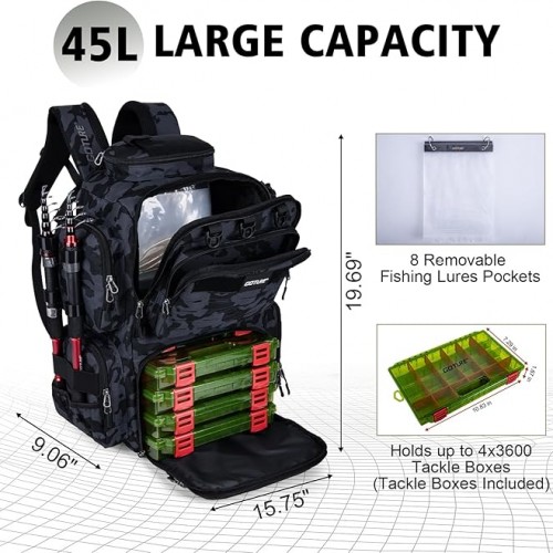 - Multi-Functional Storage Pockets: This fishing bag has a 45L large capacity storage compartment. The tackle backpack also features a sunglasses pocket, a water bottle pocket, 2 fishing rod fixing straps, 2 pliers pockets, a mesh pocket, and 8 zipper pockets for organized storage. The tactical Molle system and multiple D-rings offer endless options for hanging extra accessories. The front mesh pocket with reflective safety strips ensures visibility during low-light night fishing sessions