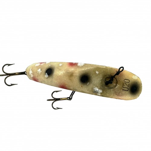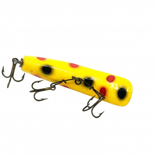 Helin Flatfish Wooden SPU YE Yellow/Spots Color. Harder to find vintage Flatfish model. About 2 7/8″ long. Used with some wear but still in ok condition, see photos. This model has a unique underwater spinning action. Fish or collect. Tougher model to find.