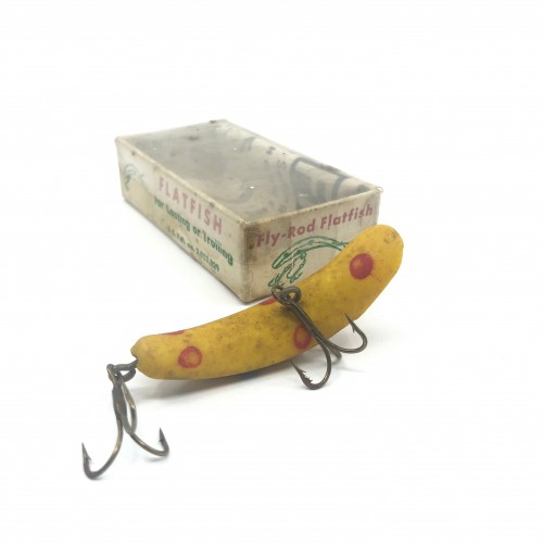 Helin Flatfish Yellow with Black and Red Spots Color with BSS Box. About 2 1/4″ long. Nice little lure. Used but in ok condition, see photos. Great for fishing and oh so many colors to collect.