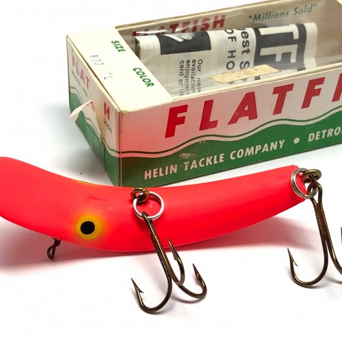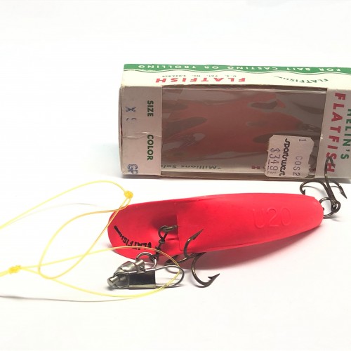 Helin Flatfsih U20 RFL (Fluorescent Red) with Box. At about 3 1/4″ long this newer flatfish is in new like condition and its matching box is in good condition with only some wear and a rip on the box. This lure would look great in your collection or tackle box.