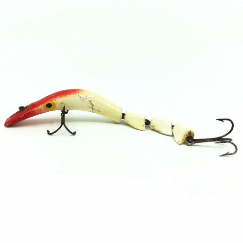 Herter’s Owechie Indian Plug, Red Head/White Color. Very hard to find triple jointed lure here. About 5 1/4″ long overall. This lure is used with some wear and scratches but in overall good condition. See photos. Fish or collect.