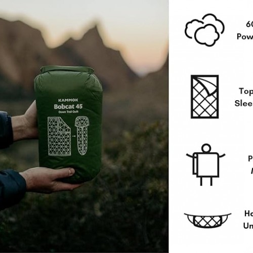 - DOWNTEK INSULATION: The Bobcat 45ºF features Downtek responsibly sourced down. Downtek is water-repellent keeping you dry and lengthening the life of your quilt. Whether in backcountry, city, or somewhere in between, this backpacking quilt offers lightweight superior warmth in unexpected places.