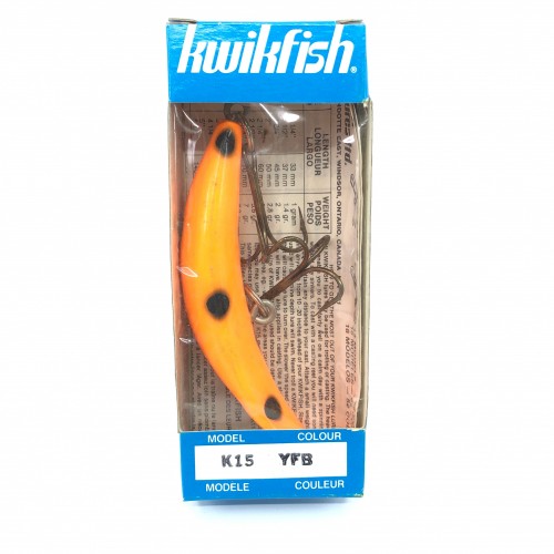 Kwikfish K15 OFC Orange Fluorescent Bottom Chartreuse Top Color New in Box Old Stock. Pre Luhr-Jensen and Pre Rapala. The K15 is listed as 5″ long and weighing 30 grams. New old stock here. Box in nice shape, note some of the boxes might have a tear to the plastic film, lure new in box, see photos. Cast or troll. Awesome lure for fishing. Grab this one while you can. Collect or fish. Great lure for trolling big water for big Muskies!