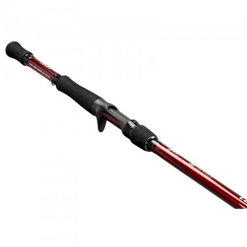 KVD series feature premium IM8 graphite blanks split-grip EVA handles brand new Lew’s proprietary Full Contact reel seats with increased blank contact rear locking reel seat on spinning models for improved comfort stainless steel guides with aluminum oxide inserts with strengthened stainless steel with zirconia insert tip top for optimal durability for use with braided lines and a patented “No Foul” hook keeper. Rods are constructed on a raw graphite blank with the rich midnight fire red finish through the handle and black guide wraps matching the famous KVD color scheme.