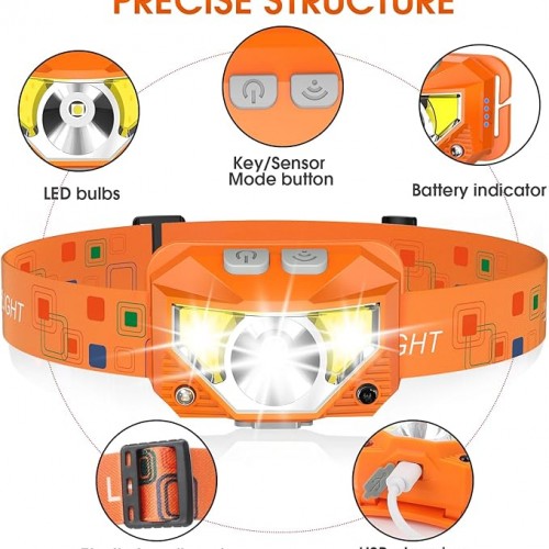 - Waterproof and 8 Modes: The headlight has IPX4 waterproof rate. The high-quality shell is more sealed and leak-proof, which is suitable for rain or snow, indoors or outdoors. The led headlamp has 8 lighting modes to meet your various needs. In key light mode, you can switch the main strong beam, main weak beam, side strong beam, side weak beam, red beam, SOS red strobe. In motion sensor mode, you can switch the main strong beam and side strong beam