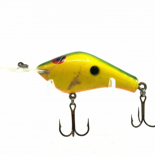 Poe’s Super Cedar Series 300, Color 45 Homer Chartreuse/Hot Belly. About 3″ long not including lip. Lure is used with some wear and some minor cracks and marks but in overall ok condition. Fish or collect, See photos.