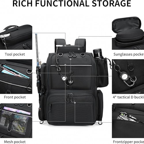 Rabjen Fishing Tackle Backpack with Rod Holders, Bottle Holder, Storage Bag Store Fishing Gear