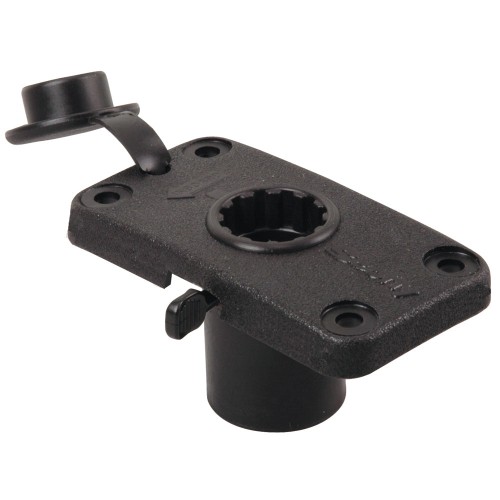 A slot in the front of the rod holder allows for a spinning reel to be securely held in position. The rod holder design has a side mounted flange, which leaves the bottom open. This allows for the rod holder to accommodate trigger grips. Pistol grip rod butts easily clear the sides of the rod holder for quick rod retrieval. Rod can be secured in holder with a soft latching strap which snaps over the top.