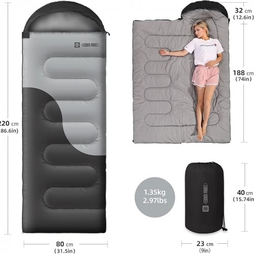 - Comfortable Sleeping Experience:Our sleeping bag can be used in 3 seasons with a design optimal comfort temperature of 59℉,,temp rating 50°F,imit 41°F.This lightweight sleeping bag is perfect for weather camping trips in Spring through to Autumn.Give you a comfortable sleep after a day of adventure outdoor camping, backpacking, hiking, and outdoor travel.