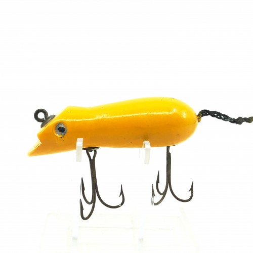 Swimming Mouse Lure, Yellow Color. Great vintage lure here, however unsure of its exact make. This lure is about 2 3/4″ long. Used with some minor wear and marks but in overall good condition. Fish or collect, see photos. Has a couple of paint touch ups on it.