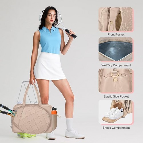 - 【Active Women’s Gym Bag】This pickleball bag comes with a ventilated shoe compartment (fits up to size 44 / US 10), keeping clean clothes and sports gear separated. The waterproof rear pouch is ideal for storing damp towels, sweaty clothes, swimwear and swim trunks. It is perfect for badminton, tennis, pickleball matches as well as other fitness training sessions.