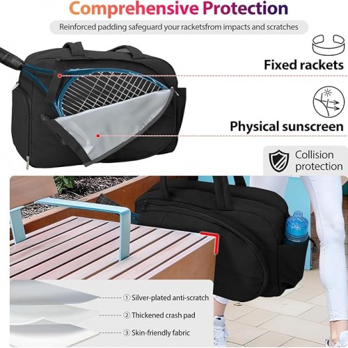 - 【Tennis Bag for Active Women 】Designed with the female athlete in mind, this sleek and functional tennis bag features a dedicated front compartment that safely stores 2-3 rackets—ideal for matches or practice. The padded interior protects your gear, while quick-access side pockets keep tennis balls and essentials within easy reach. Effortlessly transition from the court to casual outings with this stylish carryall.