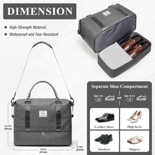 - Shoe Compartment & Dry-Wet Separation: Separate flat bottom compartment of this travel duffel bag can hold your shoes or dirty clothes for easy separation from clean clothes when traveling. This gym duffel bag for women has a waterproof PVC lined pocket that separates wet and dry items like clothes, towels and swimsuits,perfect as womens gym bag