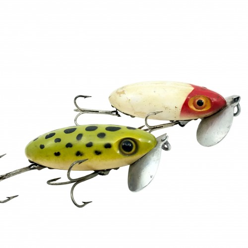 Vintage Arbogast Jitterbug Combo. Two vintage bugged eyed Jitterbug combo, one is coachdog and one is frog/white belly. Great deal here! Both lures are about 2 1/2″ long. The frog Jitterbug does have a crack near the lip. Used with some wear and marks but in overall fair condition, see photos. Both need a little TLC and then back to the boat. Priced accordingly.