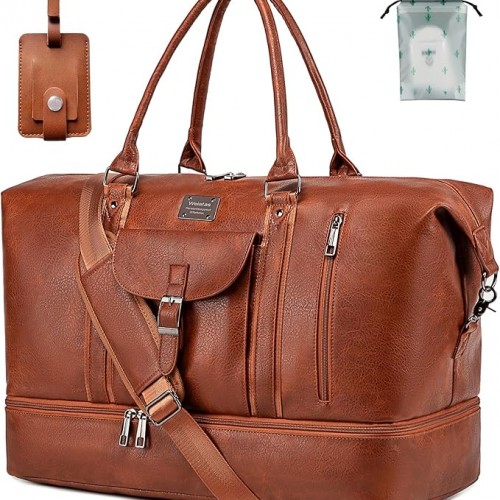 weiatas Faux Leather Travel Duffel Bag for Women Men, Large Weekender Overnight Bag with Shoes Compartment, Waterproof Carry On Bag Travel Tote Bag Gym Bag with Luggage Strap (Black)