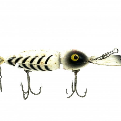 Whopper Stopper Hellbender, Silver Flitter Shore Color. Uncommon color here. About 4 1/4″ long including the lip. Used vintage lure with some wear and marks but still in overall good condition. These lures are collectible and highly sought after by fisherman. Killer on bass! Fish or collect this vintage classic bait. See photos.